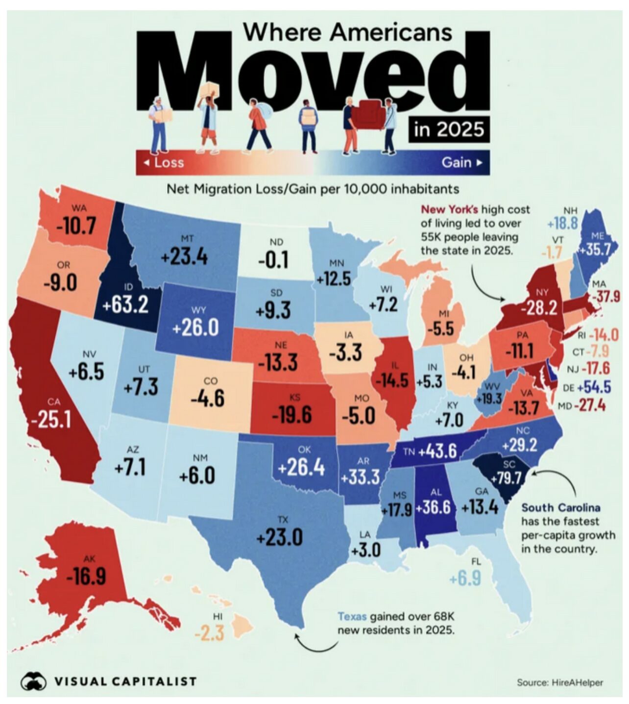 The map below displays net migration per 10,000 residents across all 50 states in 2025, highlighting where population gains and losses were greatest.